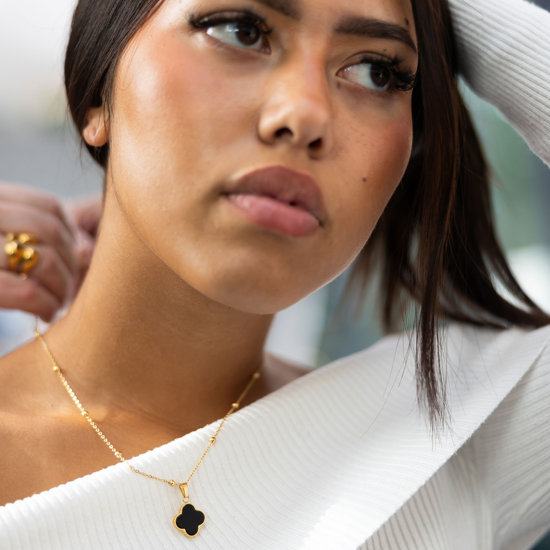 This black onyx clover-inspired pendant necklace is further elevated by its pretty satellite chain. It would make a lovely gift for someone special or treat for yourself. The perfect match for the black onyx clover earrings and bracelet.