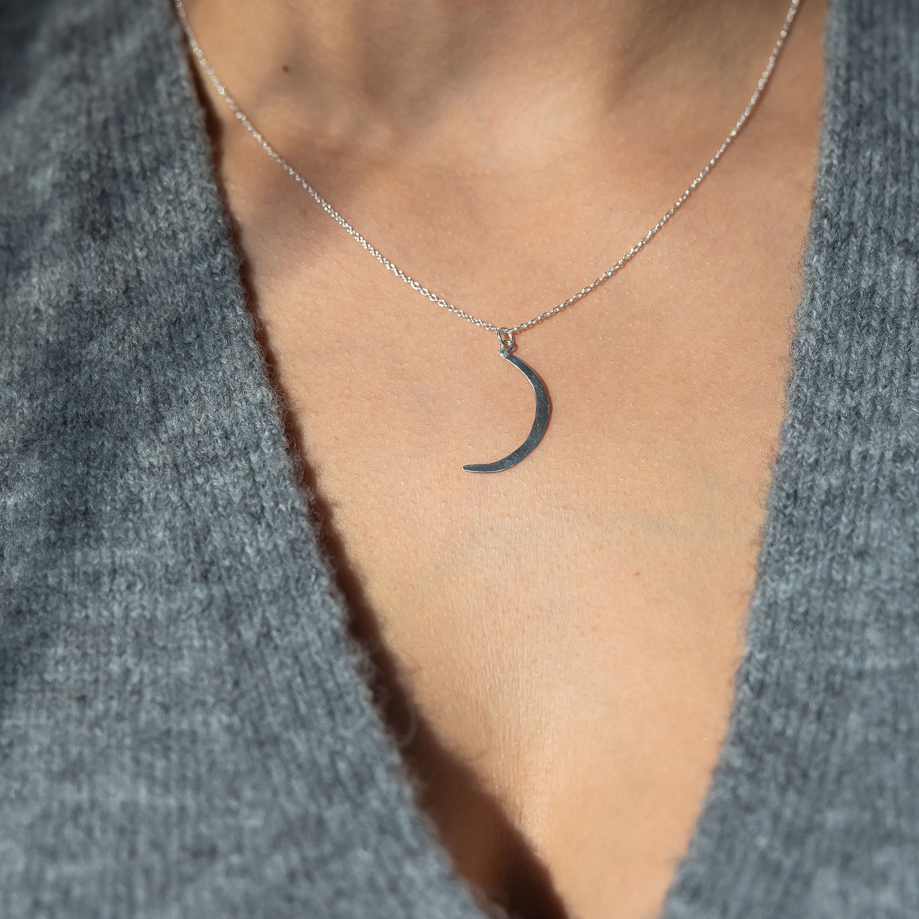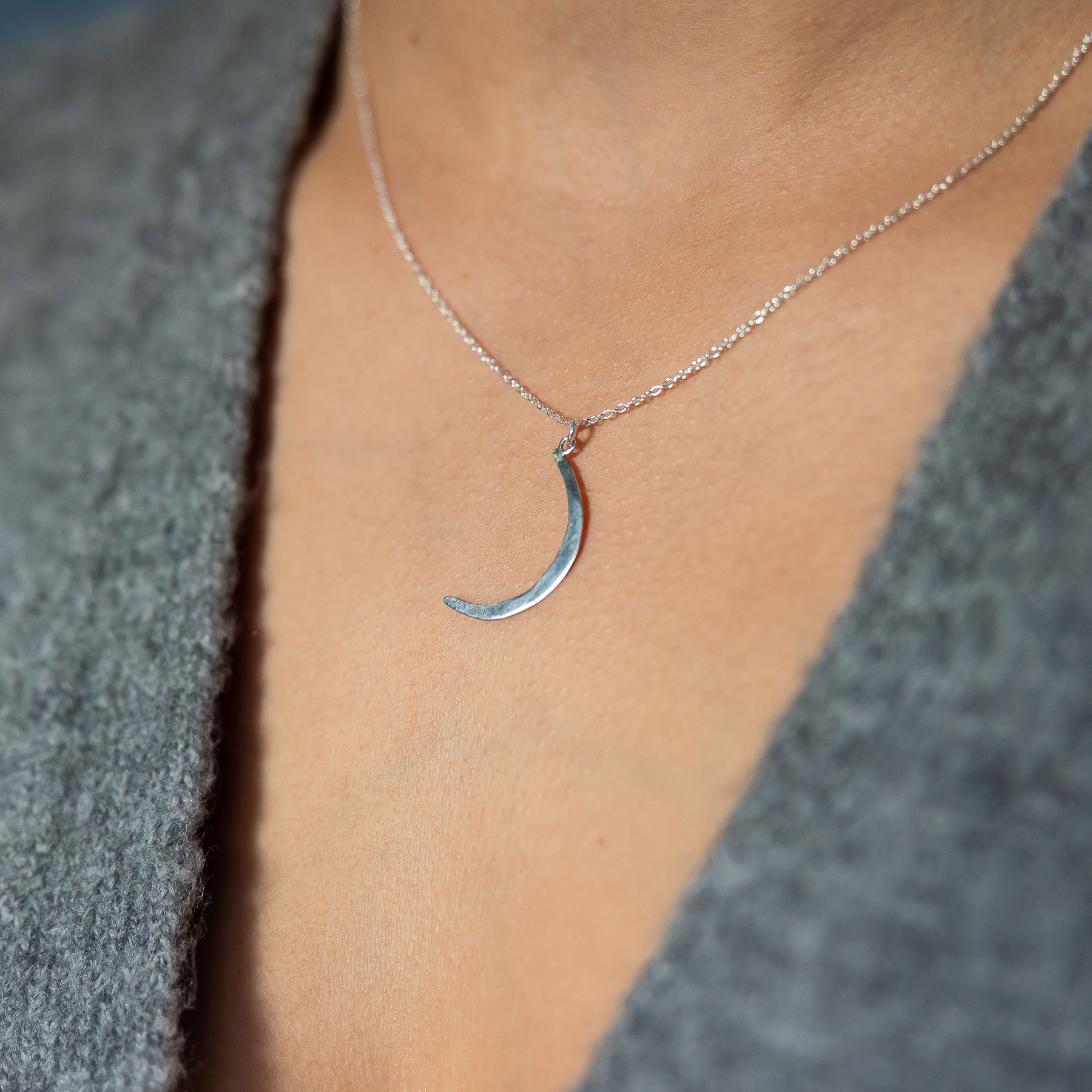 This lovely silver crescent moon pendant necklace is so easy to wear and versatile. It looks great by itself or stacked with other necklaces.