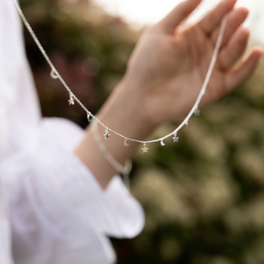 Created from sterling silver. The main chain is 16″ from end to end but its extension chain allows you to wear it up to 17.5″ or 44.5 cm. There are six moon and five star charms.