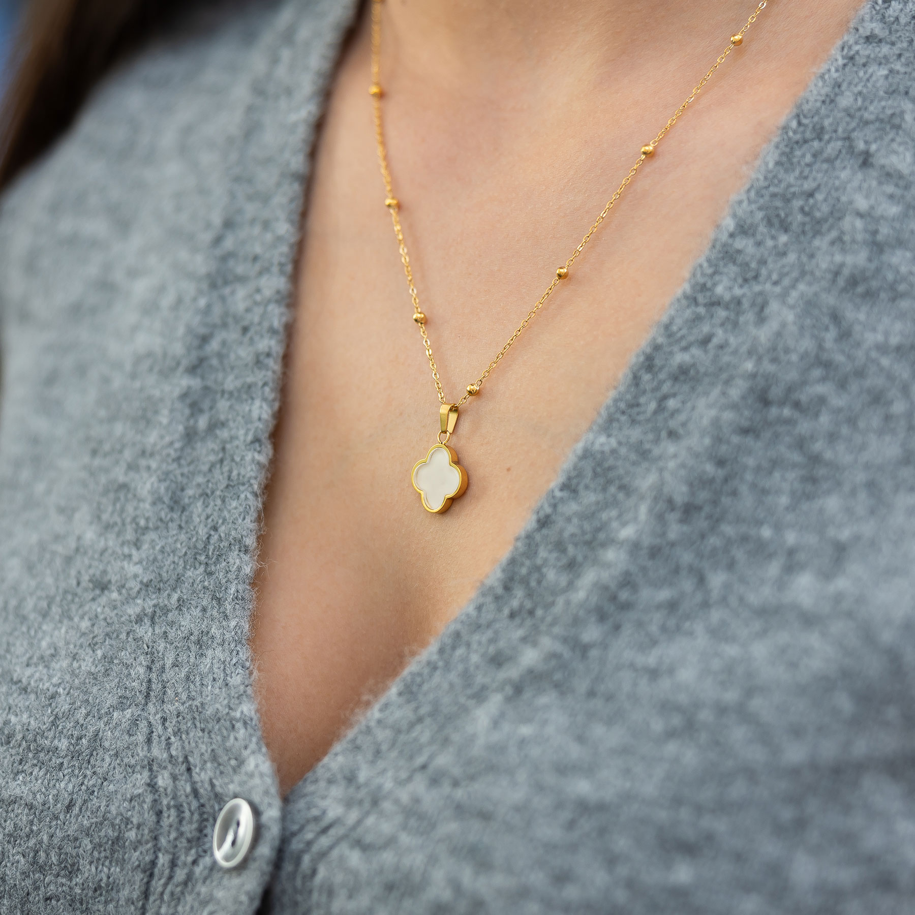 Eye-catching and elegant, this white agate clover-inspired pendant necklace is further elevated by its attractive satellite chain. It would make a lovely gift for someone special or treat for yourself. The perfect match for the white agate clover earrings and bracelet.